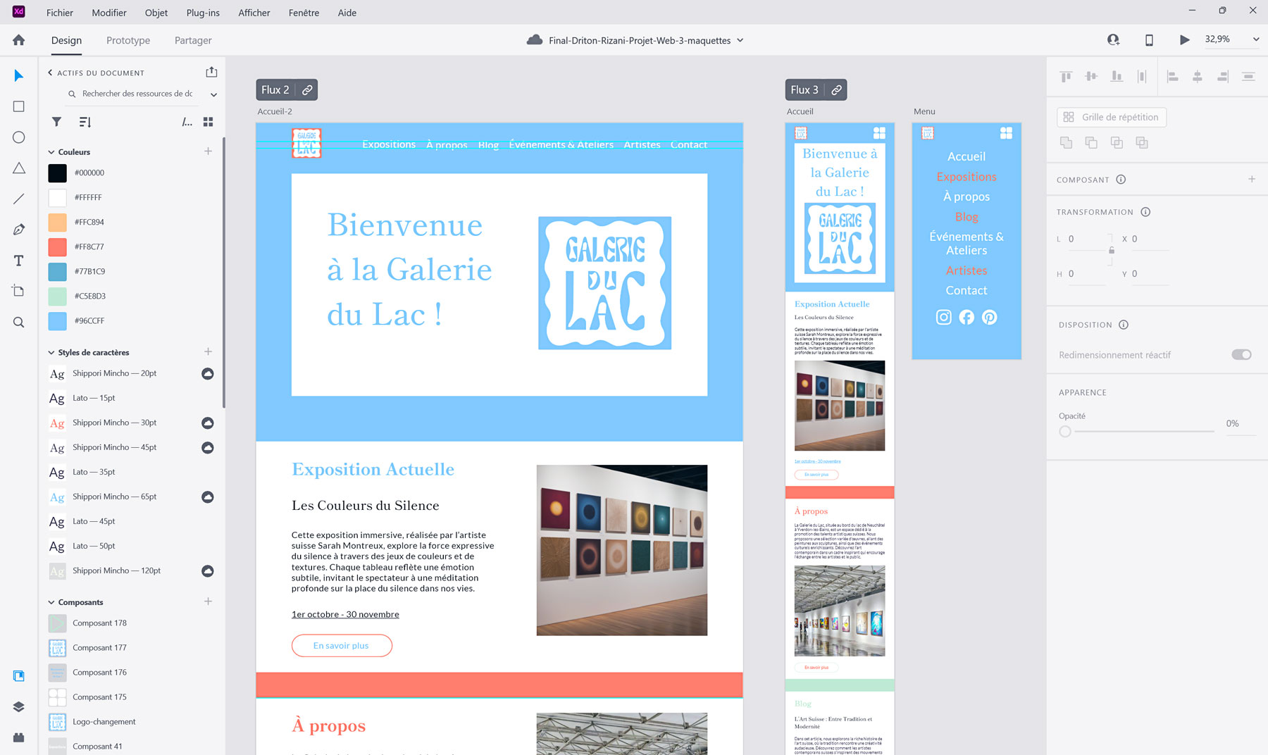 Dans le cadre de ce projet semestriel, j’ai imaginé Galerie du Lac, une fictive galerie d’art créée spécialement pour développer un site web complet et responsive. J’ai commencé par définir les valeurs, la mission et les objectifs de la galerie, puis j’ai réalisé plusieurs analyses marketing pour comprendre comment la positionner par rapport à ses concurrents et lui donner une identité unique.